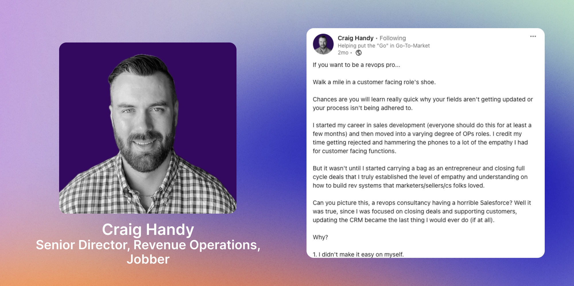 Haris's passion for revops shines through in his super-digestible educational content. His posts are packed with tips to transform revops from system admin to strategic thinking, covering everything from starting a revops career to building a team and choosing the right tools.