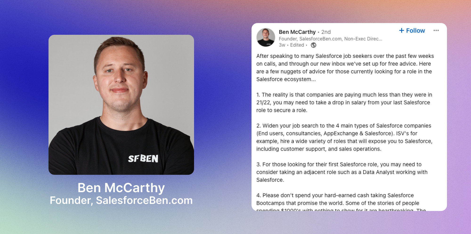Ben McCarthy founded Salesforce Ben as a community space for Salesforce knowledge, certification, careers, and other content. His profile is a must-follow for Salesforce users interested in staying up to date with latest updates and straightforward admin advice.