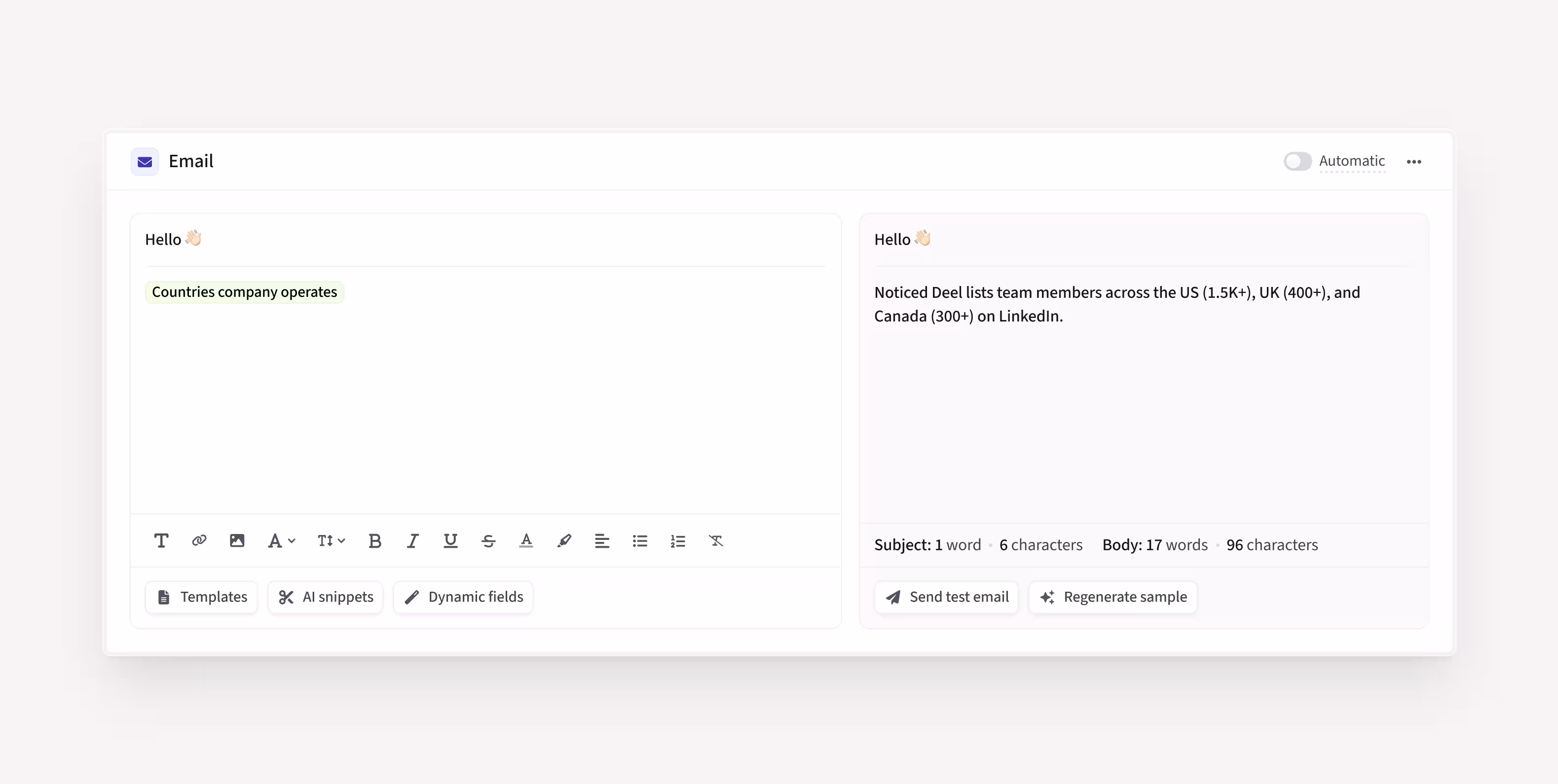 Keep the personalization factual and contextual, not flowery. AI Snippets help with that by allowing you to automatically generate personalized, natural-sounding email lines based on real lead data, so your outreach feels human and avoids robotic, repetitive language.