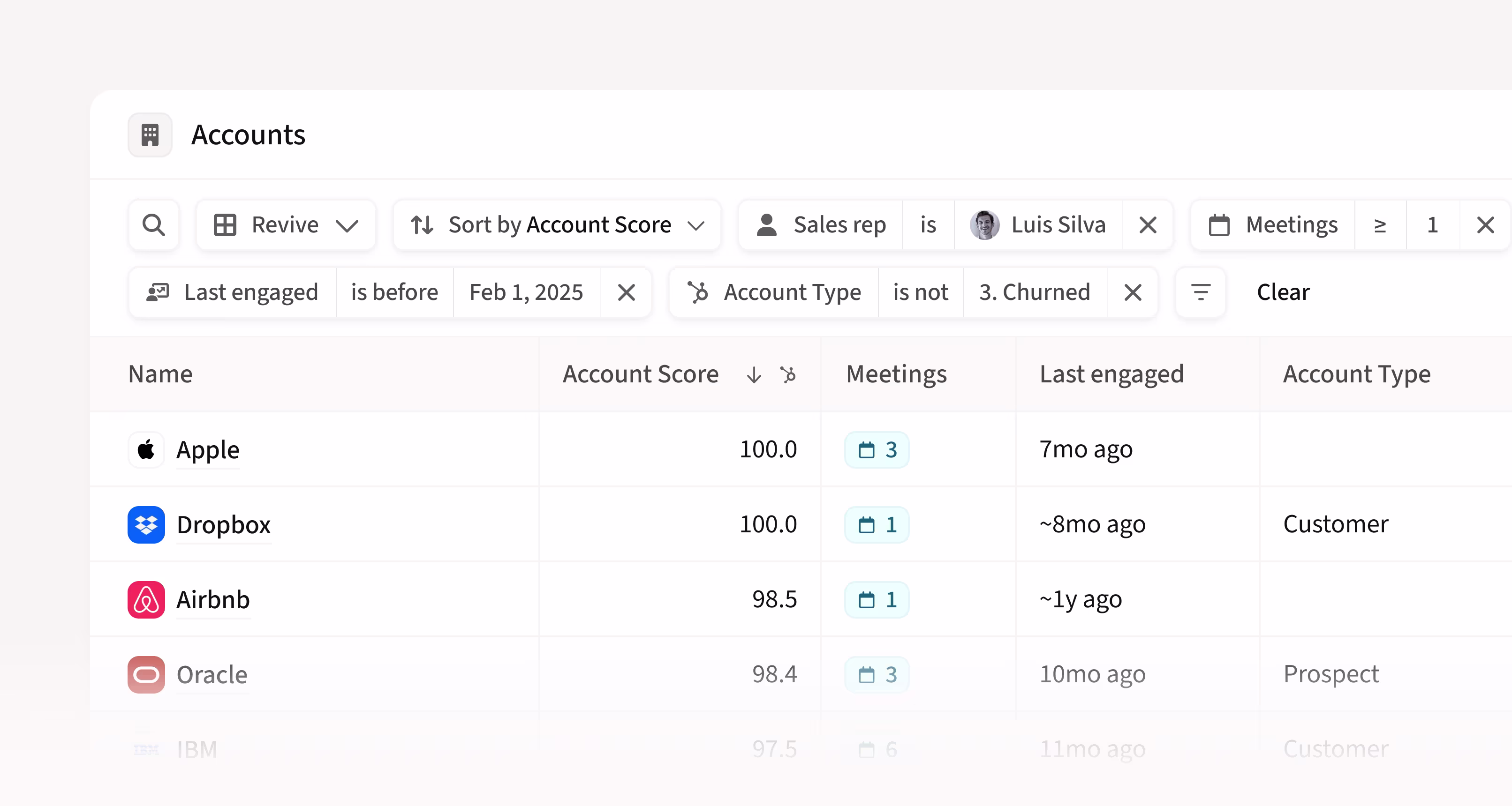 - Sort by account score (also CRM data) to prioritize the highest-value opportunities for re-engagement.