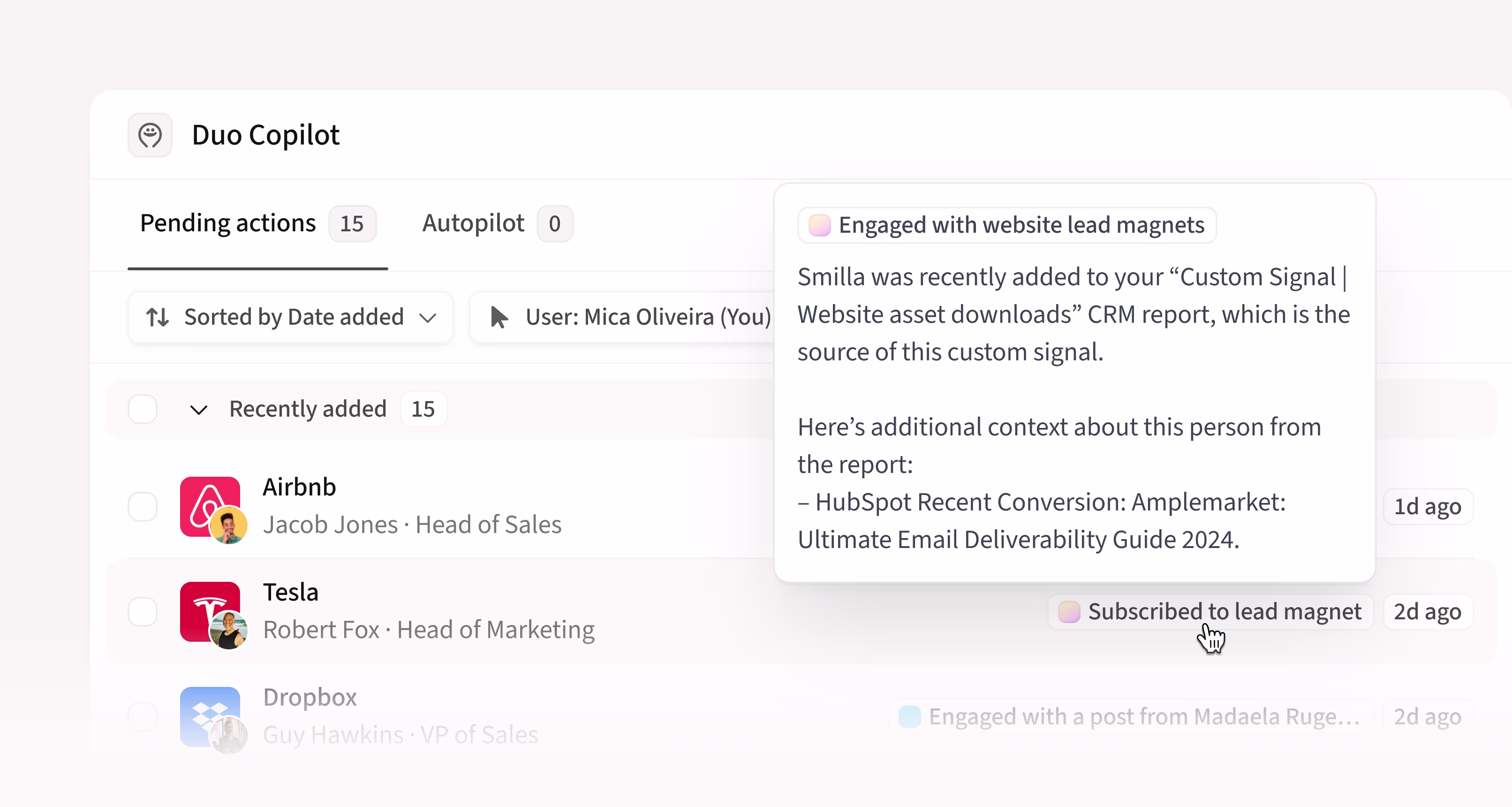 - Set up a Custom CRM Signal for “PDF Lead Magnet Download.” Connect this unique signal from Salesforce or HubSpot to Amplemarket Duo (see Amplemarket’s CRM integration)