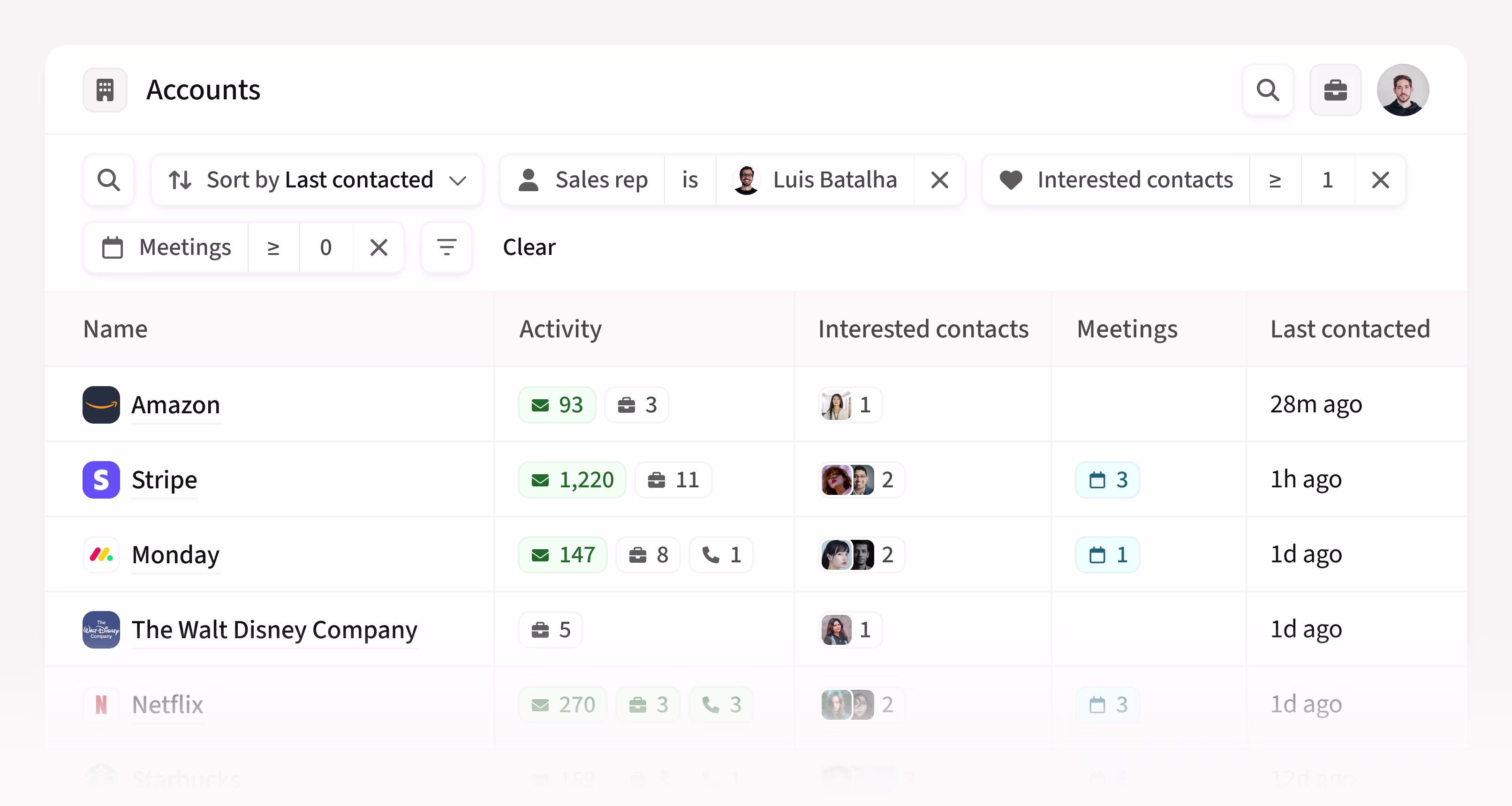 - Filter for accounts with previous meeting activity or engaged contacts, but no outbound or inbound engagement in the past six months.