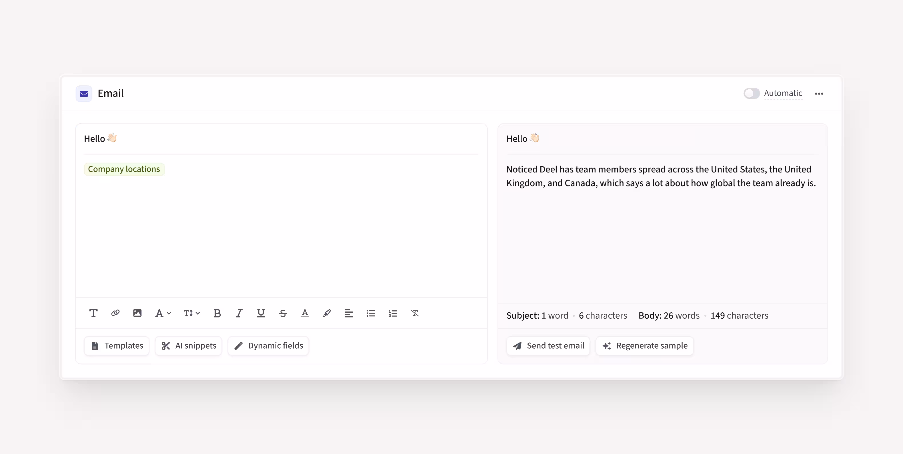βNoticed {{company_name}} has offices in the US (500 employees), India (100 employees), and Germany (50 employees).β