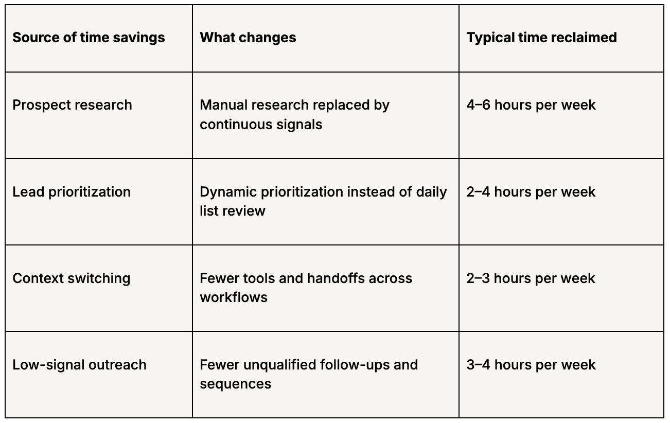 By removing manual research, improving decision-making upstream, and reducing low-signal work, many teams reclaim 15+ hours per rep per week and spend more of their time on meaningful selling.