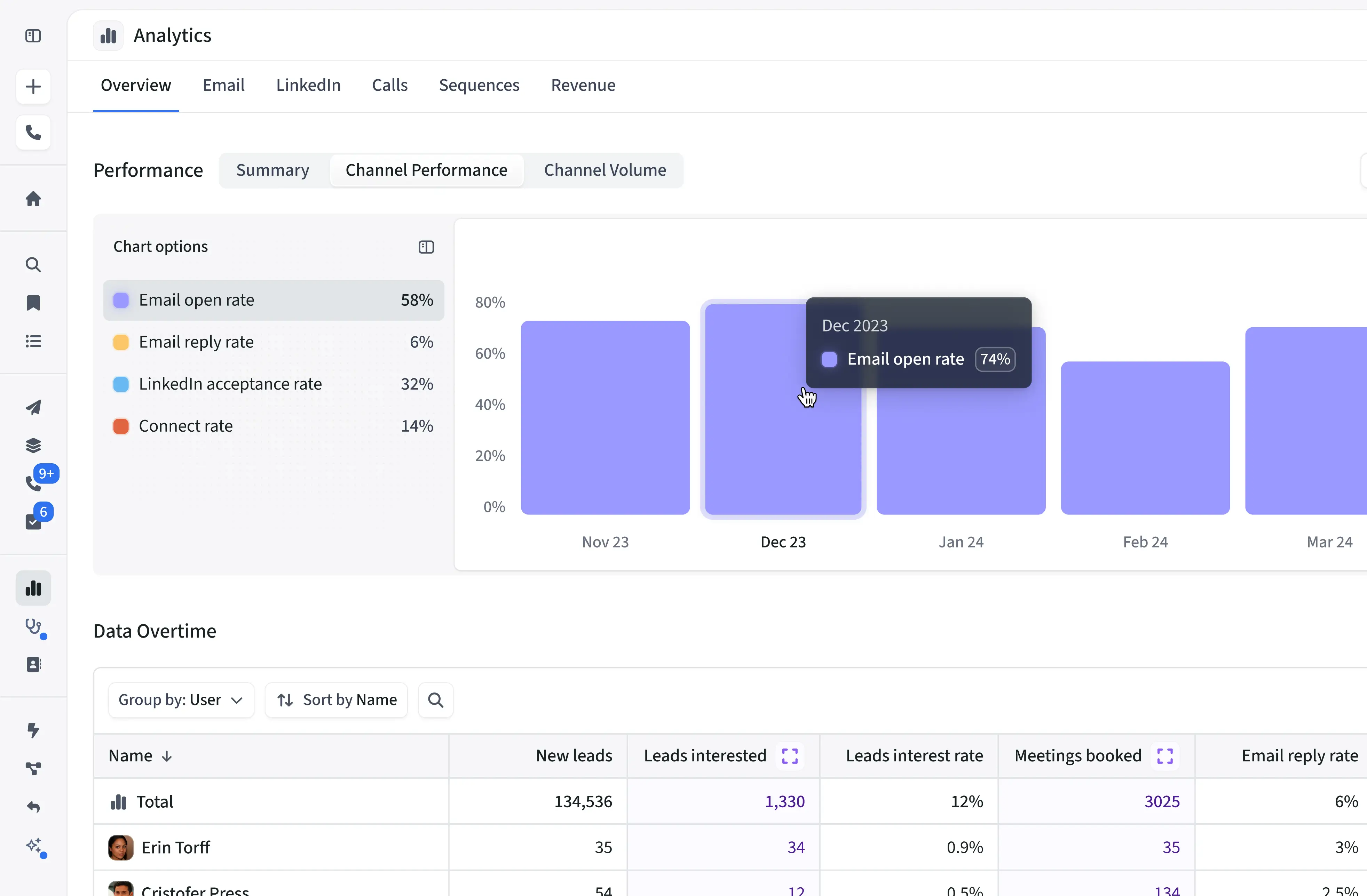 With Analytics 2.0, Sales Reps and Managers can dig deep into individual channel performance, monitor outreach sequence effectiveness, access engagement insights, and precisely attribute revenue impact.Β
