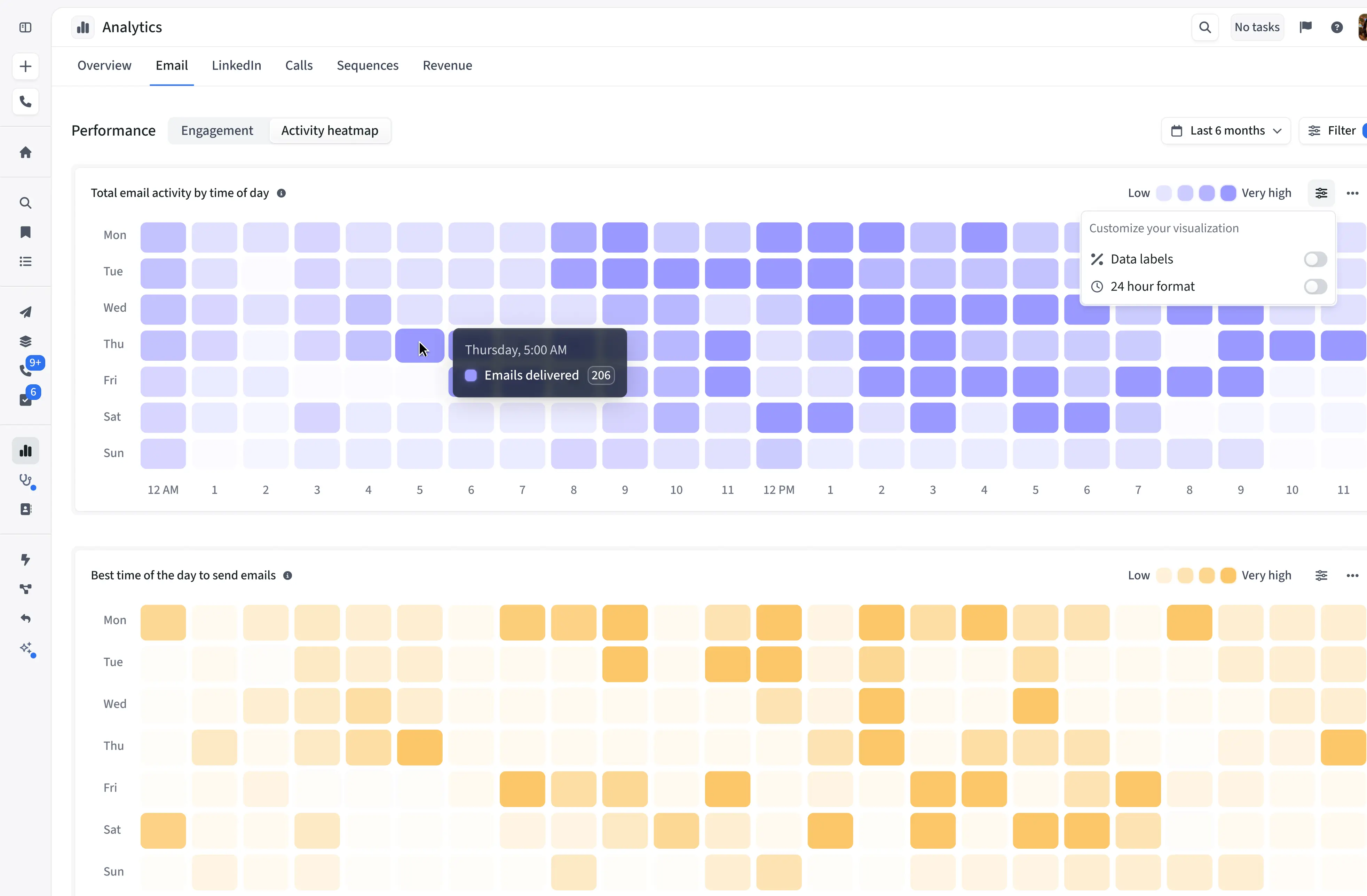 Access advanced heatmaps that display the number of successful email deliveries, the best times to send emails, and when your reply rates are highest within a given time frame.